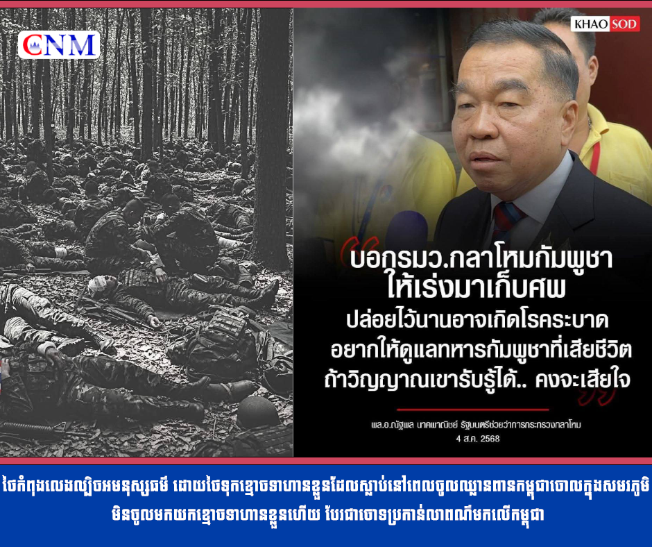 ថៃ🇹🇭កំពុងលេងល្បិចអមនុស្សធម៌ ដោយថៃទុកខ្មោចទាហានខ្លួនដែលស្លាប់នៅពេលចូលឈ្លានពានកម្ពុជាចោលក្នុងសមរភូមិ មិនចូលមកយកខ្មោចទាហានខ្លួនហើយ បែរជាចោទប្រកាន់លាពណ៌មកលើកម្ពុជា