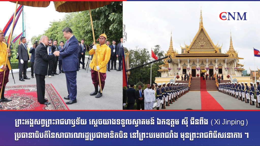 ព្រះអង្គសព្វព្រះរាជហឫទ័យ ស្តេចយាងទទួលស្វាគមន៍ ឯកឧត្តម ស៊ី ជីនពីង (Xi Jinping) ប្រធានាធិបតីនៃសាធារណរដ្ឋប្រជាមានិតចិន នៅព្រះបរមរាជវាំង មុនព្រះរាជពិធីសវនាការ