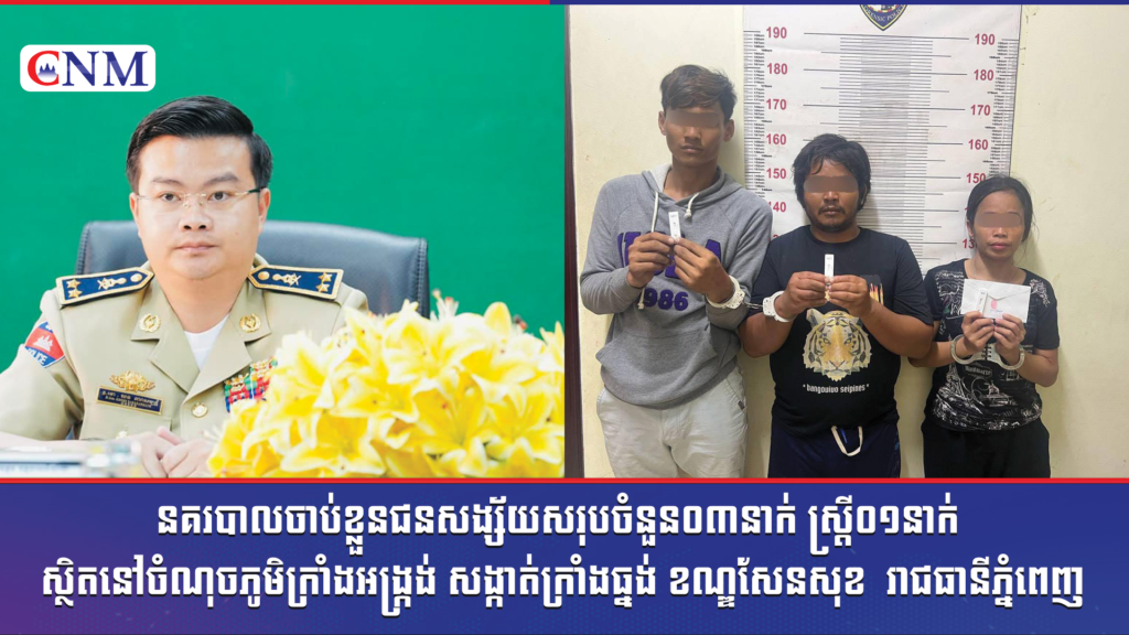 នគរបាលចាប់ខ្លួនជនសង្ស័យសរុបចំនួន០៣នាក់ ស្រ្តី០១នាក់ ស្ថិតនៅចំណុចភូមិក្រាំងអង្ក្រង់ សង្កាត់ក្រាំងធ្នង់ ខណ្ឌសែនសុខ រាជធានីភ្នំពេញ
