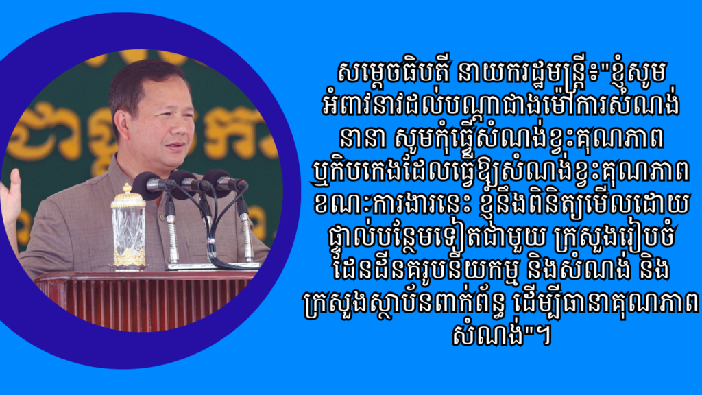 សម្តេចធិបតីនាយករដ្ឋមន្រ្តីអំពាវនាវបណ្តាអ្នកម៉ៅការសំណង់ ត្រូវគិតពីគុណភាព