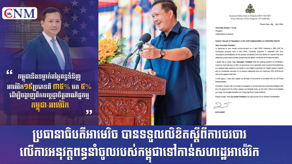 ប្រធានាធិបតីអាមេរិច បានទទួលលិខិតស្តីពីការចរចារ លេីការអនុវត្តពន្ធនាំចូលរបស់កម្ពុជាទៅកាន់សហរដ្ឋអាម៉េរិក និងបានបង្ហោះលើបណ្តាញសង្គមផ្លូវការរបស់លោក