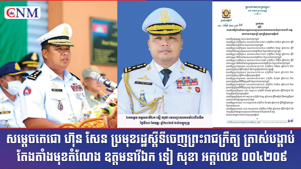 សម្តេចតេជោ ហ៊ុន សែន ប្រមុខរដ្ឋស្តីទីចេញព្រះរាជក្រឹត្យ ត្រាស់បង្គាប់ តែងតាំងមុខតំណែង ឧត្តមនាវីឯក ទៀ សុខា អត្តលេខ ០០៤២០៩ ជាអគ្គលេខាធិការ នៃគណៈ កម្មាធិការជាតិសន្តិសុខលម្អសមុទ្រ