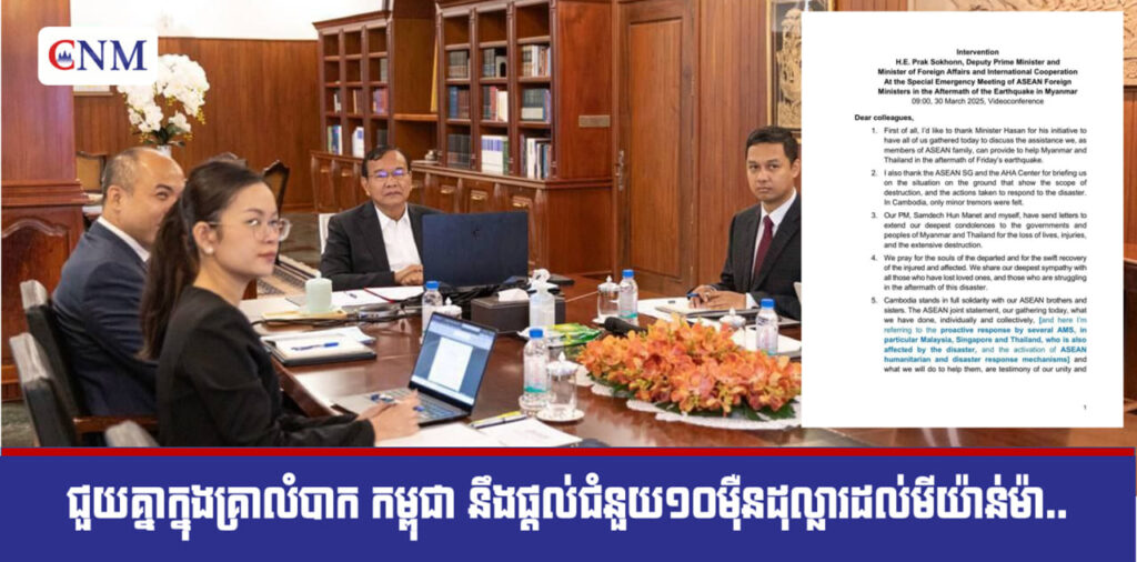 ជួយគ្នាក្នុងគ្រាលំបាក កម្ពុជា នឹងផ្តល់ជំនួយ១០ម៉ឺនដុល្លារដល់មីយ៉ាន់ម៉ា! នេះបើតាម ប្រមុខការទូតកម្ពុជា ឯ.ឧ ប្រាក់ សុខុន នីក្នុងកិច្ចប្រជុំបន្ទាន់នៅព្រឹកថ្ងៃអាទិត្យទី៣០មិនា៕