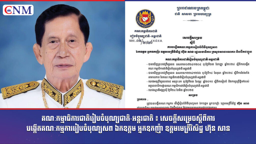 គណ:កម្មាធិការជាតិរៀបចំបុណ្យជាតិ-អន្តរជាតិ ៖ សេចក្តីសម្រេចស្តីពីការបង្កើតគណ:កម្មការរៀបចំបុណ្យសព ឯកឧត្តម អ្នកឧកញ៉ា ឧត្តមមេត្រីវិសិដ្ឋ ហ៊ុន សាន