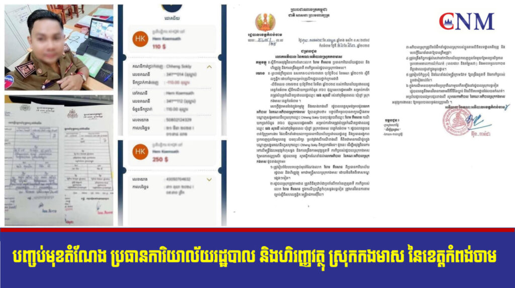 បញ្ចប់តំណែងប្រធានការិយាល័យរដ្ឋបាល និងហិរញ្ញវត្ថុ ស្រុកកងមាស នៃខេត្តកំពង់ចាម មួយរូប ដោយសារយកលុយ ៣៦០ដុល្លារ ពីប្រជាពលរដ្ឋ រឿងកែតម្រូវសំបុត្រកំណើត។ នេះបេីយោងតាមលិខិតមួយរបស់រដ្ឋបាលខេត្តកំពង់ចាម...