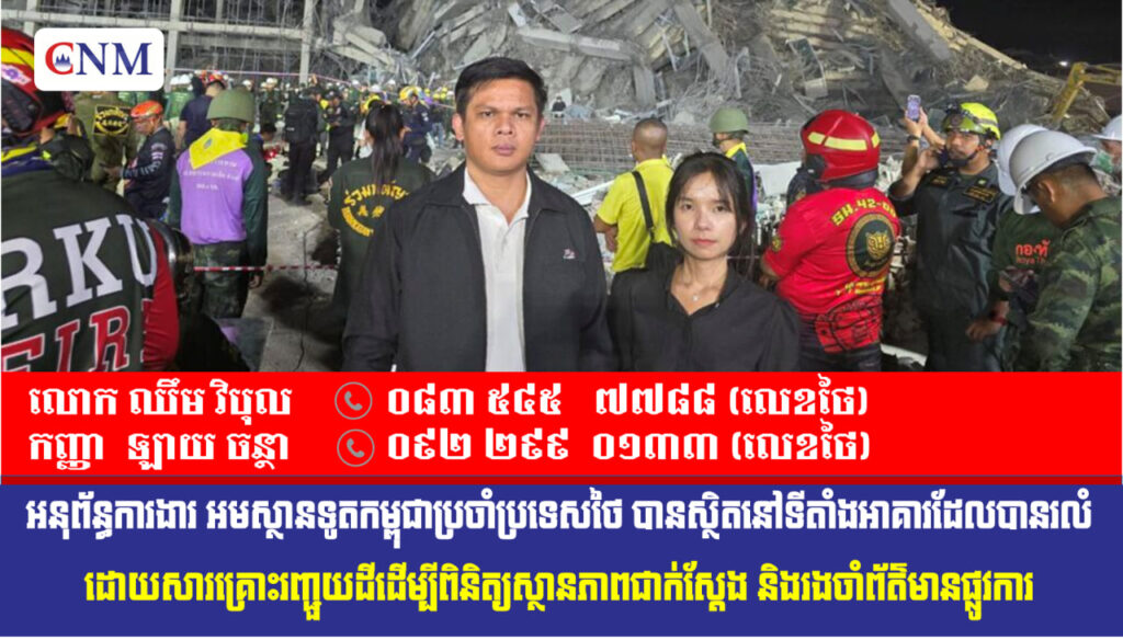 📣អនុព័ន្ធការងារ អមស្ថានទូតកម្ពុជាប្រចាំប្រទេសថៃ បានស្ថិតនៅទីតាំងអាគារដែលបានរលំដោយសារគ្រោះរញ្ជួយដីដើម្បីពិនិត្យស្ថានភាពជាក់ស្តែង និងរងចាំព័ត៌មានផ្លូវការ