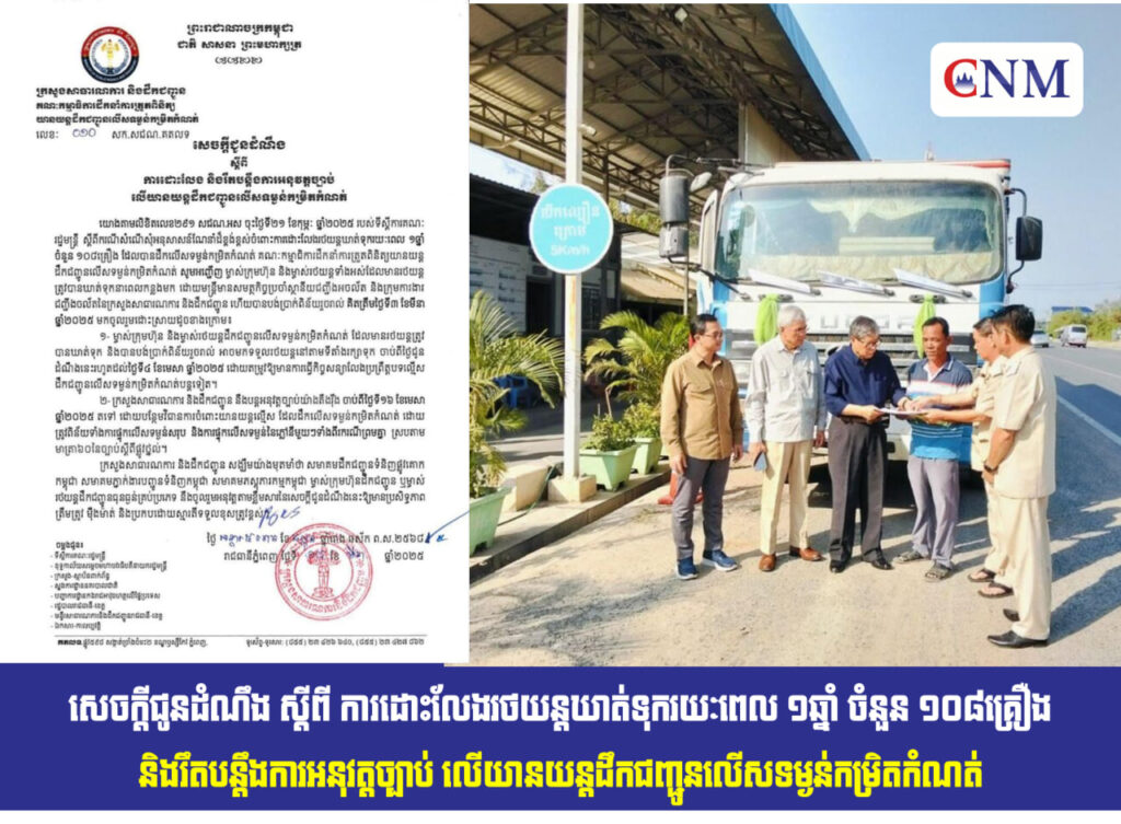 📣សេចក្តីជូនដំណឹង ស្តីពី ការដោះលែងរថយន្តឃាត់ទុករយៈពេល ១ឆ្នាំ ចំនួន ១០៨គ្រឿង និងរឹតបន្តឹងការអនុវត្តច្បាប់ លើយានយន្តដឹកជញ្ជូនលើសទម្ងន់កម្រិតកំណត់