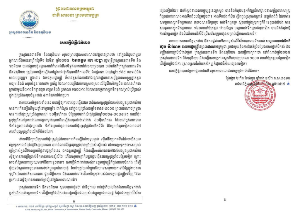 ក្រសួងធនធានទឹក និងឧតុនិយម ចេញសេចក្តីបំភ្លឺព័ត៌មាន ឆ្លើយតបទៅនឹងការលើកឡើងរបស់វិទ្យុបរទេសមួយ ដែលផ្សាយបំភ្លៃក្នុងចេតនា ទុច្ចរិត និងបំភាន់មតិសាធារណៈ