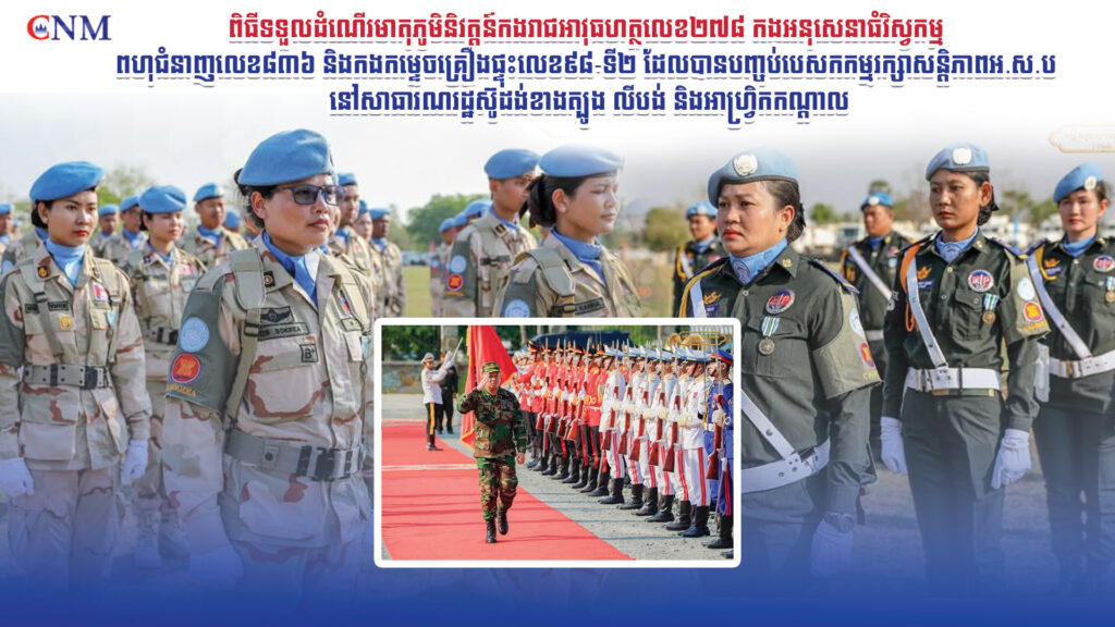 ពិធីទទួលដំណើរមាតុភូមិនិវត្តន៍កងរាជអាវុធហត្ថលេខ២៧៨ កងអនុសេនាធំវិស្វកម្មពហុជំនាញលេខ៨៣៦ និងកងកម្ទេចគ្រឿងផ្ទុះលេខ៩៨-ទី២ ដែលបានបញ្ចប់បេសកកម្មរក្សាសន្តិភាពអ.ស.ប នៅសាធារណរដ្ឋស៊ូដង់ខាងត្បូង លីបង់ និងអាហ្រ្វិកកណ្តាល.. ពិធីនេះ ធ្វើឡើង ក្រោមអធិបតីភាពដ៏ខ្ពង់ខ្ពស់...