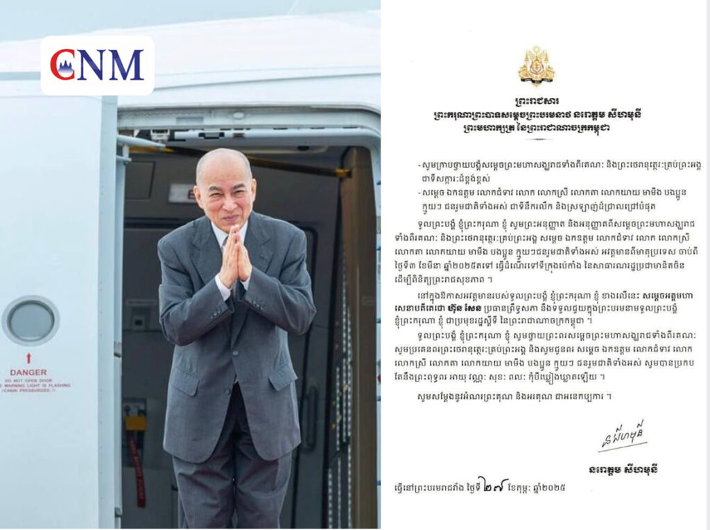 ព្រះករុណាព្រះបាទសម្ដេចព្រះបរមនាថ នរោត្ដម សីហមុនីព្រះមហាក្សត្រ នៃព្រះរាជាណាចក្រកម្ពុជា ជាទីគោរពសក្ការៈដ៏ខ្ពង់ខ្ពស់បំផុត ព្រះអង្គសព្វព្រះរាជហឬទ័យ ស្តេច នឹងយាងទៅទីក្រុងប៉េកាំងសាធារណរដ្ឋប្រជាមានិតចិន ដើម្បីពិនិត្យព្រះរាជសុខភាពនា ថ្ងៃទី៣...