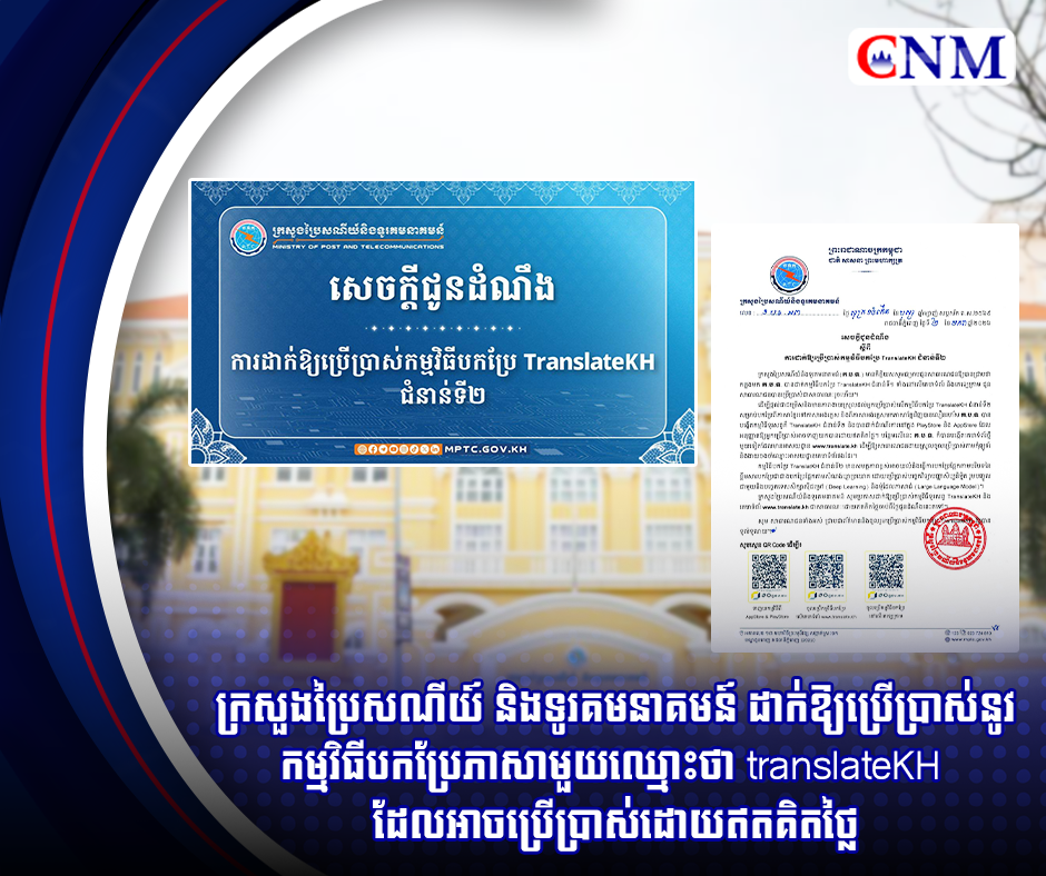 ក្រសួងប្រៃសណីយ៍ និងទូរគមនាគមន៍ ដាក់ឱ្យប្រើប្រាស់នូវកម្មវិធីបកប្រែភាសាមួយឈ្មោះថា translateKH ដែលអាចប្រើប្រាស់ដោយឥតគិតថ្លៃ