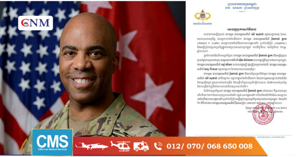 នាយឧត្ដមសេនីយ៍ រ៉ូណាល់ ខ្លាក (RONALD P. CLARK) មេបញ្ជាការកងទ័ពជើងគោកសហរដ្ឋអាមេរិក ប្រចាំប៉ាស៊ីហ្វិក (USARPAC) នឹងអញ្ជើញបំពេញទស្សនកិច្ចផ្លូវការនៅកម្ពុជា...
