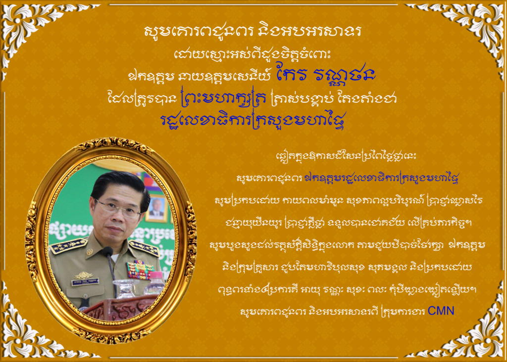 សូមគោរពជូនពរ និងអបអរសាទរដោយស្មោះ អស់ពីដួងចិត្តចំពោះនាយឧត្តមសេនីយ៍ កែវ វណ្ណថន ក្នុងពេលដែលត្រូវបាន ព្រះមហាក្សត្រ ត្រាស់បង្គាប់ តែងតាំងជា រដ្ឋលេខាធិការក្រសួងមហាផ្ទៃ...