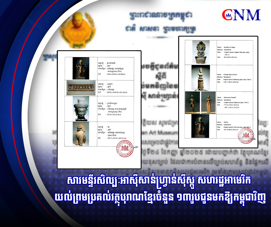 (ភ្នំពេញ)៖ ក្រសួងវប្បធម៌ និងវិចិត្រសិល្បៈកម្ពុជា នៅព្រឹកថ្ងៃទី១៨ ខែធ្នូ ឆ្នាំ២០២៥នេះ បានចេញសេចក្តីប្រកាសព័ត៌មានដោយបញ្ជាក់ថា សារមន្ទីរសិល្បៈអាស៊ីសាន់ហ្រ្វាន់ស៊ីស្កូ សហរដ្ឋអាមេរិក (Asian...