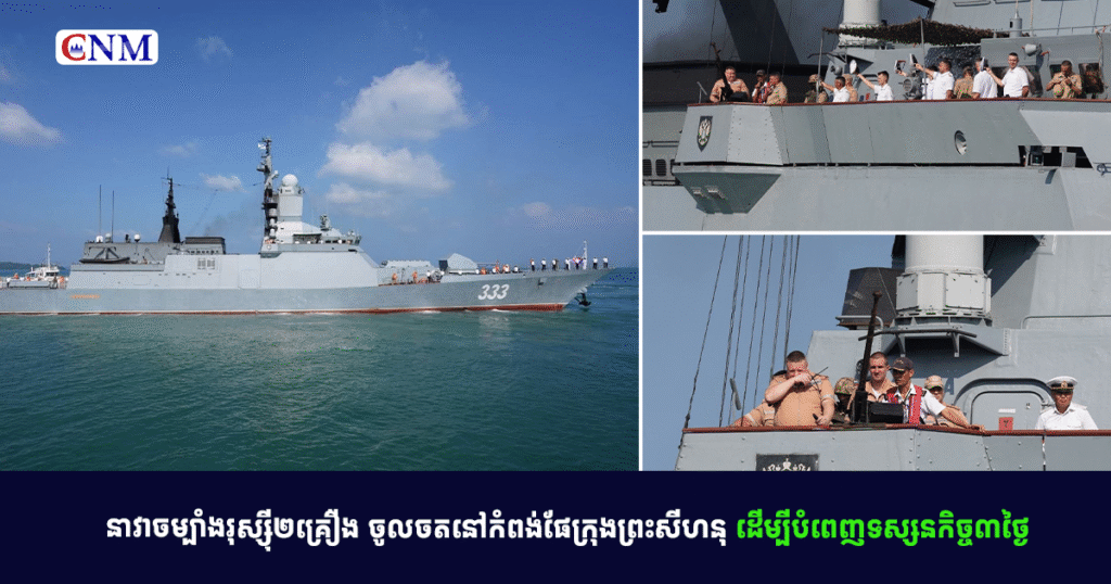 នៅព្រឹកថ្ងៃទី៦ ខែមេសា ឆ្នាំ២០២៦នេះ នាវាចម្បាំងរបស់រុស្ស៊ីចំនួន២គ្រឿង បានចូលចតនៅកំពង់ផែស្វយ័តក្រុងព្រះសីហនុ ដើម្បីបំពេញទស្សនកិច្ចរយៈពេល៣ថ្ងៃនៅកម្ពុជា។ នាវាចម្បាំងទាំងពីរគ្រឿងនេះ មកពីកងនាវាប្រចាំតំបន់ប៉ាស៊ីហ្វិកនៃកងទ័ពជើងទឹកសហព័ន្ធរុស្ស៊ី។ នាវាចម្បាំងរបស់រុស្ស៊ីដែលចតនៅកម្ពុជាពីថ្ងៃទី៦ ដល់ទី៨...