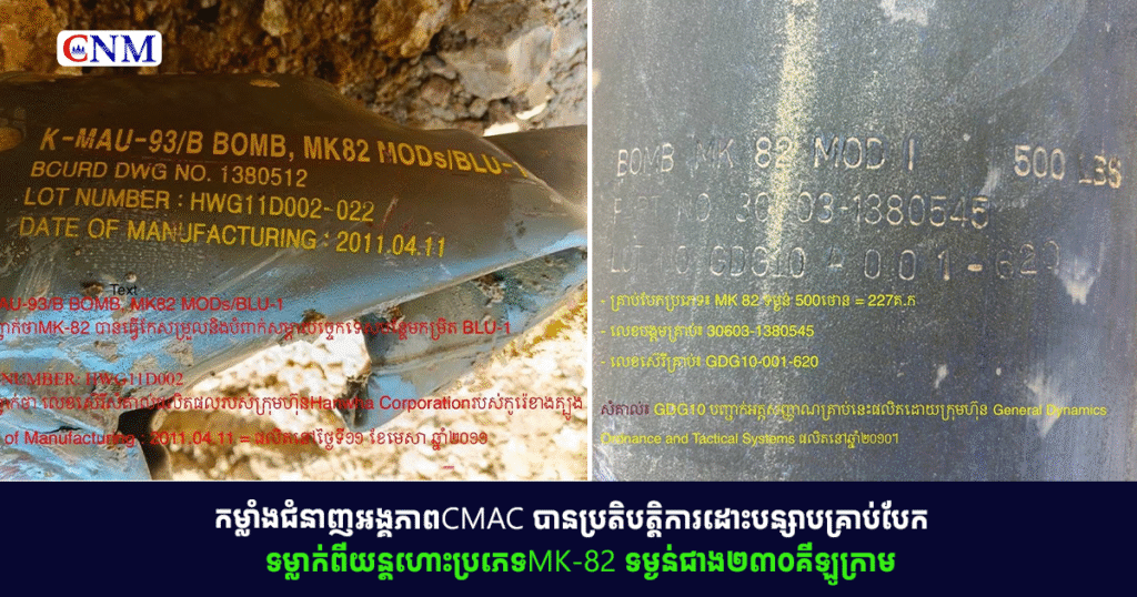 កម្លាំងជំនាញអង្គភាពCMAC បានប្រតិបត្តិការដោះបន្សាបគ្រាប់បែកទម្លាក់ពីយន្តហោះប្រភេទMK-82 ទម្ងន់ជាង២៣០គីឡូក្រាម