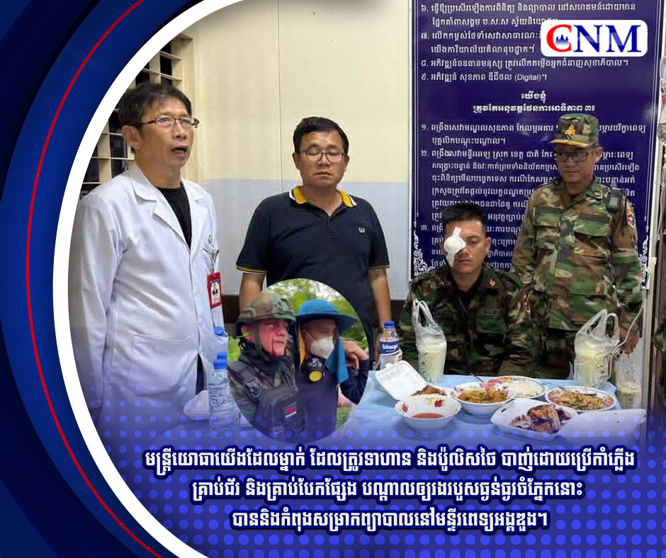 មន្រ្តីយោធាយើងដែលម្នាក់ ដែលត្រូវទាហាន និងប៉ូលិសថៃ បាញ់ដោយប្រើកាំភ្លើងគ្រាប់ជ័រ និងគ្រាប់បែកផ្សែង បណ្តាលឲ្យរងរបួសធ្ងន់ធ្ងរចំភ្នែកនោះ បាននិងកំពុងសម្រាកព្យាបាលនៅមន្ទីរពេទ្យអង្គឌួង។ មន្រ្តីយោធារូបនេះ គឺពលបាលឯក ម៉ន...