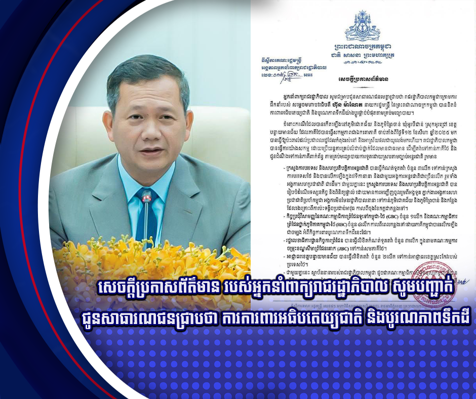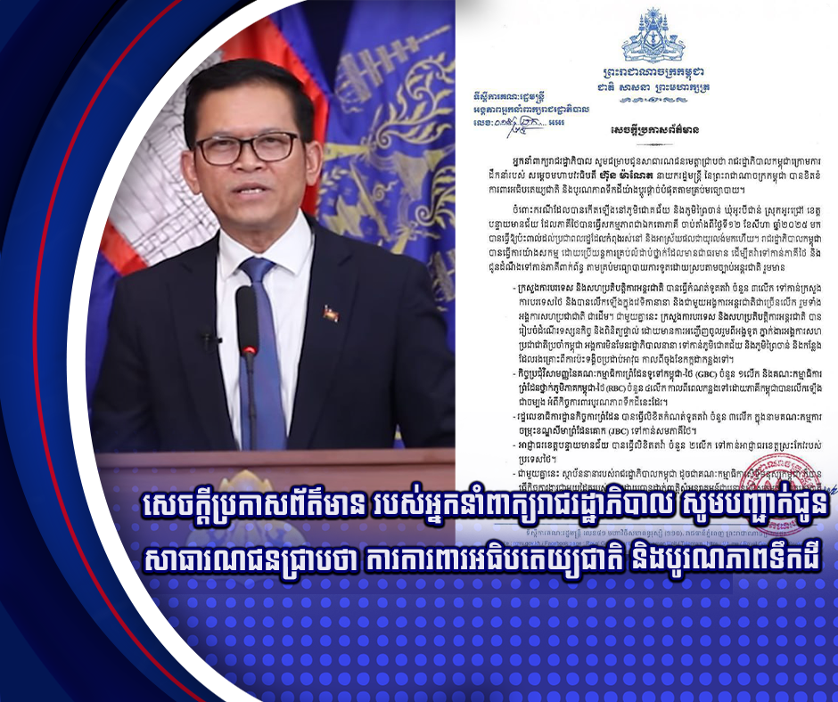 សេចក្តីប្រកាសព័ត៌មាន របស់អ្នកនាំពាក្យរាជរដ្ឋាភិបាល សូមបញ្ជាក់ជូនសាធារណជនជ្រាបថា ការការពារអធិបតេយ្យជាតិ និងបូរណភាពទឹកដី