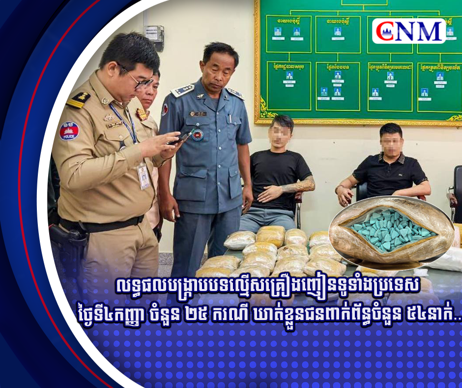 លទ្ធផលបង្ក្រាបបទល្មើសគ្រឿងញៀនទូទាំងប្រទេស ថ្ងៃទី៤កញ្ញា ចំនួន ២៥ ករណី ឃាត់ខ្លួនជនពាក់ព័ន្ធចំនួន ៥៤នាក់