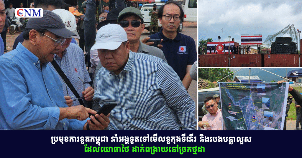 ប្រមុខការទូតកម្ពុជា នាំអង្គទូតទៅមើលទូកុងទីនើរ និងរបងបន្លាលួស ដែលយោធាថៃ ដាក់ពង្រាយនៅច្រកថ្មដា