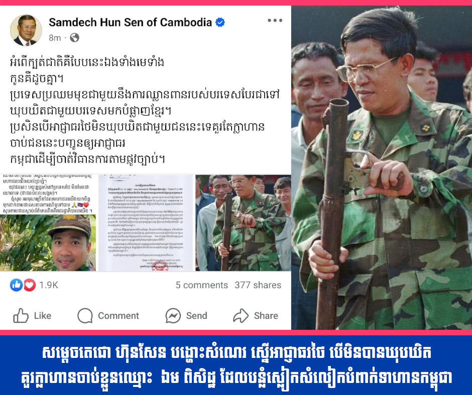សម្តេចតេជោ ហ៊ុន សែន បង្ហោះសំណេរ ស្នើអាជ្ញាធរថៃ បើមិនបានឃុបឃិត គួរក្លាហានចាប់ខ្លួនឈ្មោះ ឯម ពិសិដ្ឋ ដែលបន្លំស្លៀកសំលៀកបំពាក់ទាហានកម្ពុជា
