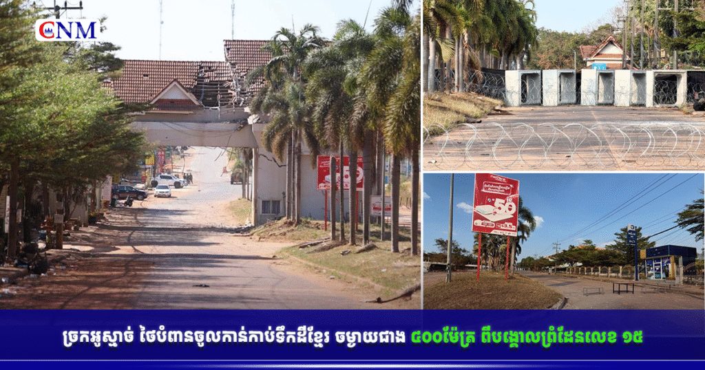 ថៃបានបំពានចូលកាន់កាប់ទឹកដីខ្មែរ ចម្ងាយជាង ៤០០ម៉ែត្រ ពីបង្គោលព្រំដែនលេខ ១៥ ដែលទទួលស្គាល់ជាផ្លូវការ ដោយបានរាយបន្លាលួស និងដាក់លូរាំងខ្ទប់រំលោភច្បាប់ អន្តរជាតិ។ នេះបើតាម...