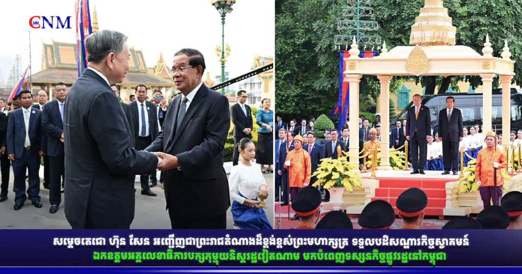 សម្ដេចតេជោ ហ៊ុន សែន អញ្ជើញជាព្រះរាជតំណាងដ៏ខ្ពង់ខ្ពស់ព្រះមហាក្សត្រ ទទួលបដិសណ្ឋារកិច្ចស្វាគមន៍ ឯកឧត្តមអគ្គលេខាធិការបក្សកុម្មុយនិស្តរដ្ឋវៀតណាម មកបំពេញទស្សនកិច្ចផ្លូវរដ្ឋនៅកម្ពុជា នៅព្រះបរមរាជវាំង នាព្រឹកថ្ងៃសុក្រ ៤រោច...
