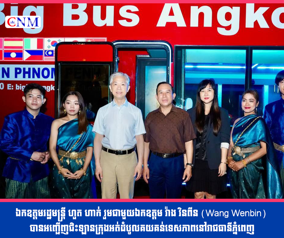 ឯកឧត្តមរដ្ឋមន្ត្រី ហួត ហាក់ រួមជាមួយឯកឧត្តម វ៉ាង វិនពីន (Wang Wenbin) បានអញ្ជើញជិះឡានក្រុងអត់ដំបូលគយគន់ទេសភាពនៅរាជធានីភ្នំពេញ
