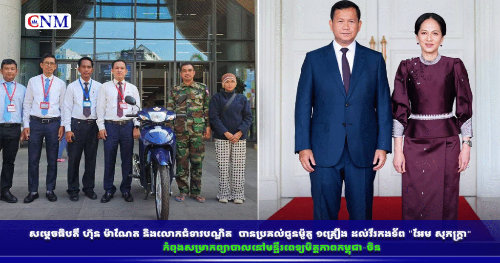 សម្តេចធិបតី ហ៊ុន ម៉ាណែត និងលោកជំទាវបណ្ឌិត បានប្រគល់ជូនម៉ូតូ ១គ្រឿង ដល់វីរកងទ័ព “អែម សុភក្រ្តា”កំពុងសម្រាកព្យាបាលនៅមន្ទីរពេទ្យមិត្តភាពកម្ពុជា-ចិន