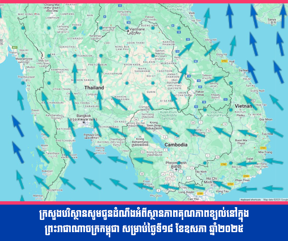 ក្រសួងបរិស្ថានសូមជូនដំណឹងអំពីស្ថានភាពគុណភាពខ្យល់នៅក្នុងព្រះរាជាណាចក្រកម្ពុជា សម្រាប់ថ្ងៃទី១៨ ខែឧសភា ឆ្នាំ២០២៥