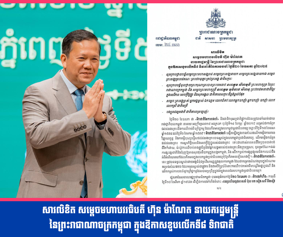 សារលិខិត សម្តេចមហាបវរធិបតី ហ៊ុន ម៉ាណែត នាយករដ្ឋមន្ត្រី នៃព្រះរាជាណាចក្រកម្ពុជា ក្នុងឱកាសខួបលើកទី៨ ទិវាជាតិ