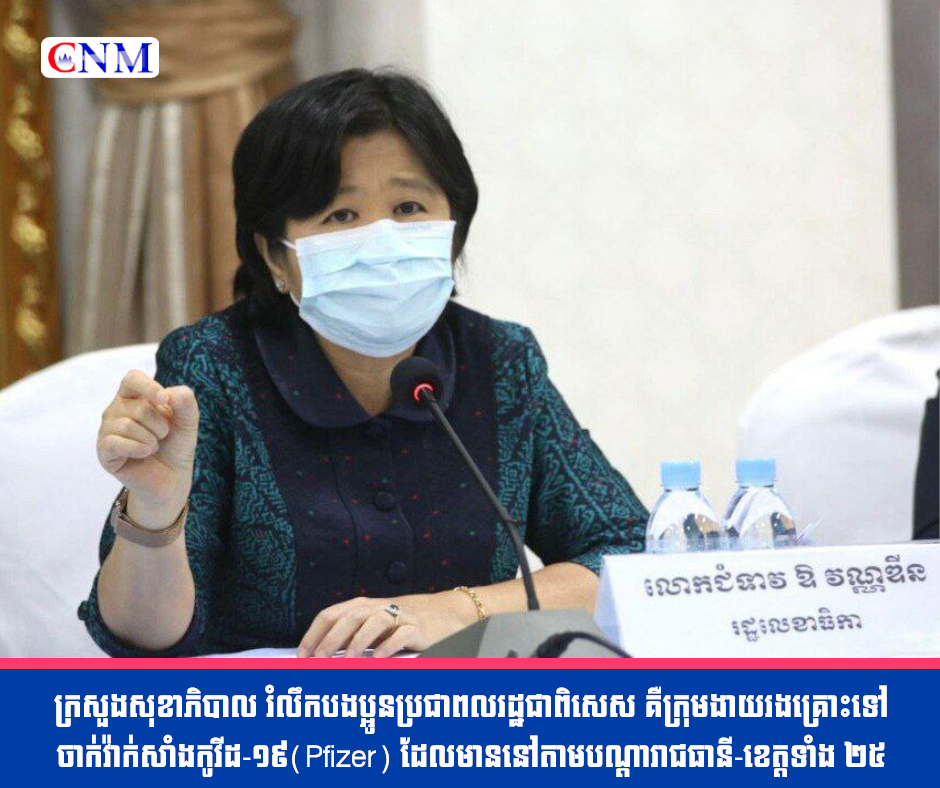 ក្រសួងសុខាភិបាល រំលឹកបងប្អូនប្រជាពលរដ្ឋជាពិសេស គឺក្រុមងាយរងគ្រោះទៅចាក់វ៉ាក់សាំងកូវីដ-១៩(Pfizer) ដែលមាននៅតាមបណ្តារាជធានី-ខេត្តទាំង ២៥