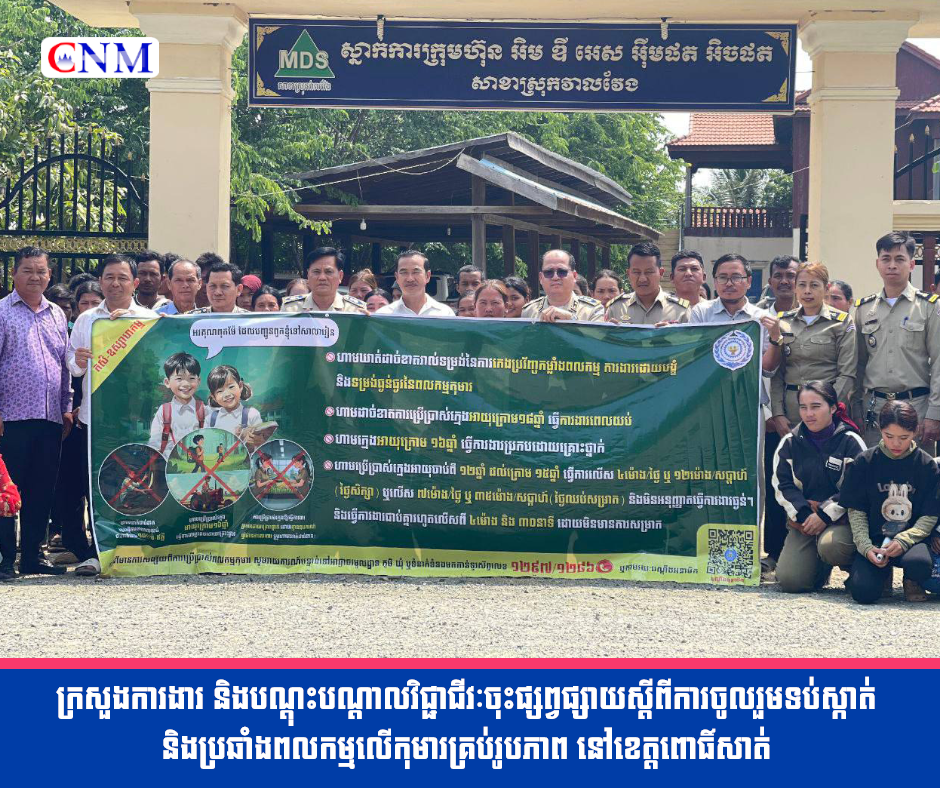 (ពោធិ៍សាត់)៖ ក្រសួងការងារ និងបណ្ដុះបណ្ដាលវិជ្ជាជីវៈ បានសហការជាមួយមន្ទីរការងារ និងបណ្តុះបណ្តាលវិជ្ជាជីវៈខេត្តពោធិ៍សាត់ ចុះផ្សព្វផ្សាយ និងចងបដាស្តីពីការបង្ការ និងទប់ស្កាត់ការប្រើប្រាស់ពលកម្មកុមារនៅតាមសហគ្រាស គ្រឹះស្ថានផលិតឥដ្ឋ ក្បឿង...