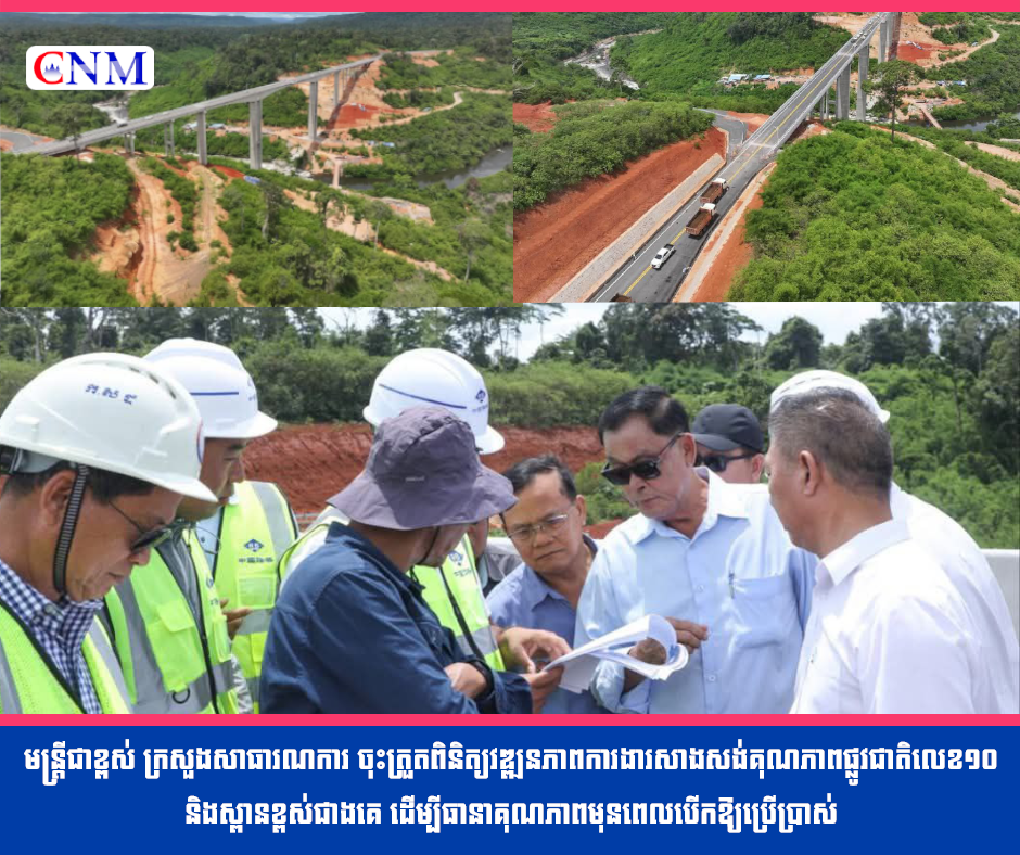 មន្ត្រីជាខ្ពស់ ក្រសួងសាធារណការ ចុះត្រួតពិនិត្យវឌ្ឍនភាពការងារសាងសង់គុណភាពផ្លូវជាតិលេខ១០ និងស្ពានខ្ពស់ជាងគេ ដើម្បីធានាគុណភាពមុនពេលបើកឱ្យប្រើប្រាស់