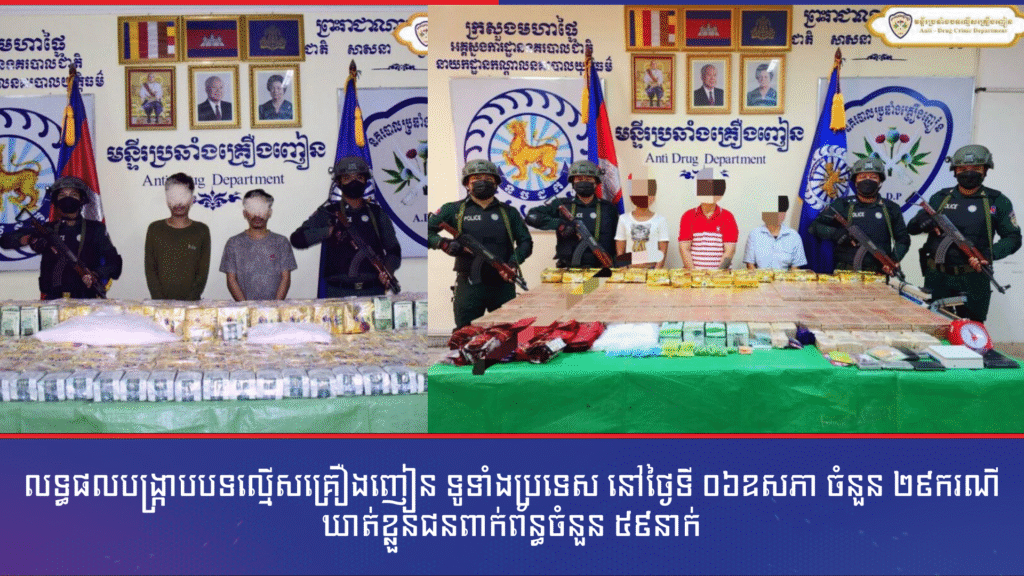 បទល្មើសគ្រឿងញៀន ទូទាំងប្រទេស នៅថ្ងៃទី ០៦ឧសភា ចំនួន ២៩ករណី ឃាត់ខ្លួនជនពាក់ព័ន្ធចំនួន ៥៩នាក់