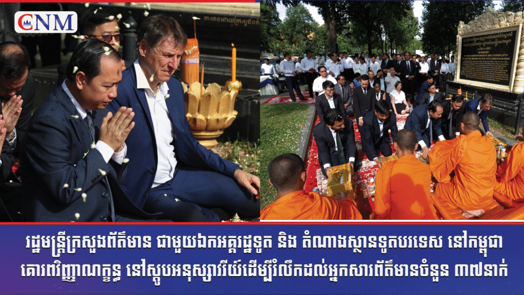 រដ្ឋមន្ត្រីក្រសួងព័ត៌មាន ជាមួយឯកអគ្គរដ្ឋទូត និង តំណាងស្ថានទូតបរទេស នៅកម្ពុជា គោរពវិញ្ញាណក្ខន្ធ នៅស្តូបអនុស្សាវរីយ៍ដើម្បីរំលឹកដល់អ្នកសារព័ត៌មានចំនួន ៣៧នាក់