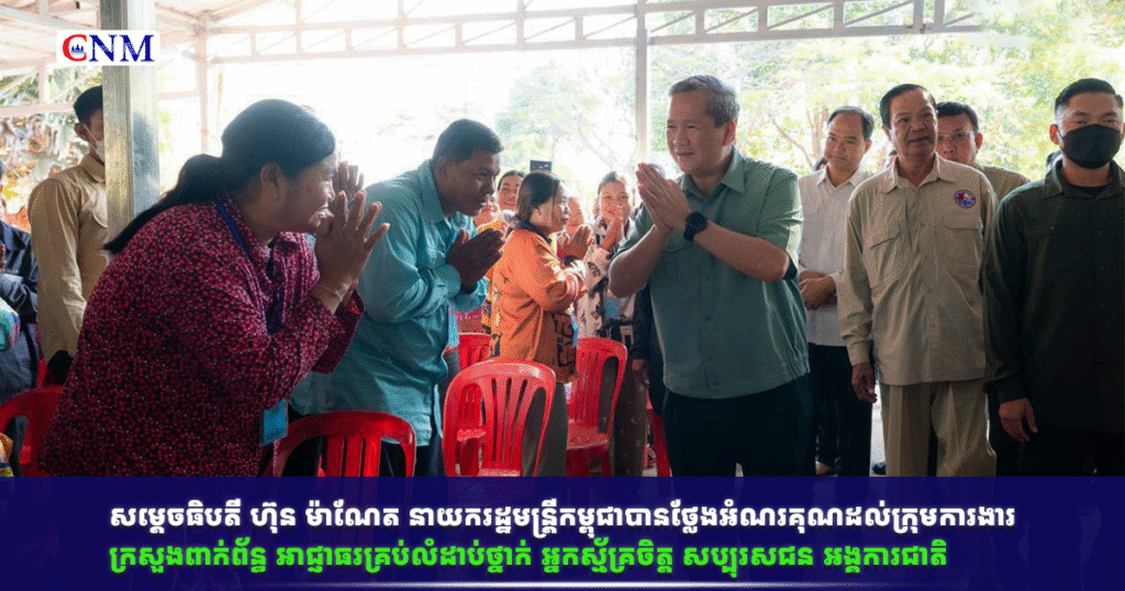 សម្តេចធិបតី ហ៊ុន ម៉ាណែត នាយករដ្ឋមន្ត្រីកម្ពុជាបានថ្លែងអំណរគុណដល់ក្រុមការងារ ក្រសួងពាក់ព័ន្ធ អាជ្ញាធរគ្រប់លំដាប់ថ្នាក់ អ្នកស្ម័គ្រចិត្ត សប្បុរសជន អង្គការជាតិ