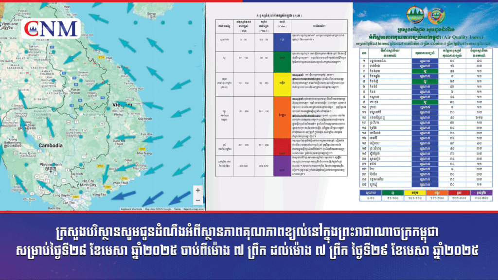ក្រសួងបរិស្ថានសូមជូនដំណឹងអំពីស្ថានភាពគុណភាពខ្យល់នៅក្នុងព្រះរាជាណាចក្រកម្ពុជា សម្រាប់ថ្ងៃទី២៨ ខែមេសា ឆ្នាំ២០២៥ ចាប់ពីម៉ោង ៧ ព្រឹក ដល់ម៉ោង ៧ ព្រឹក ថ្ងៃទី២៩ ខែមេសា ឆ្នាំ២០២៥