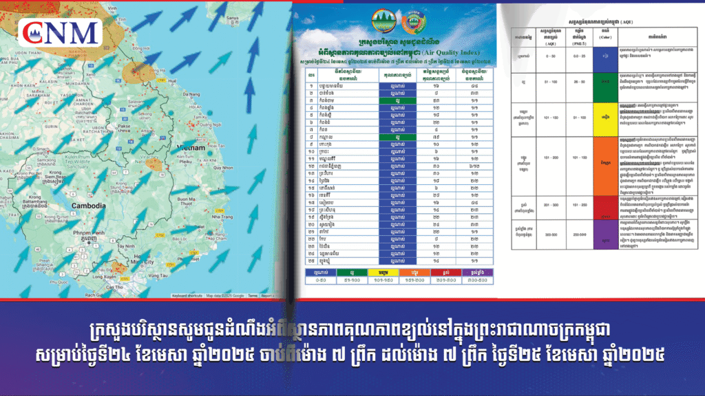 ក្រសួងបរិស្ថានសូមជូនដំណឹងអំពីស្ថានភាពគុណភាពខ្យល់នៅក្នុងព្រះរាជាណាចក្រកម្ពុជា សម្រាប់ថ្ងៃទី២៤ ខែមេសា ឆ្នាំ២០២៥ ចាប់ពីម៉ោង ៧ ព្រឹក ដល់ម៉ោង ៧ ព្រឹក ថ្ងៃទី២៥ ខែមេសា ឆ្នាំ២០២៥