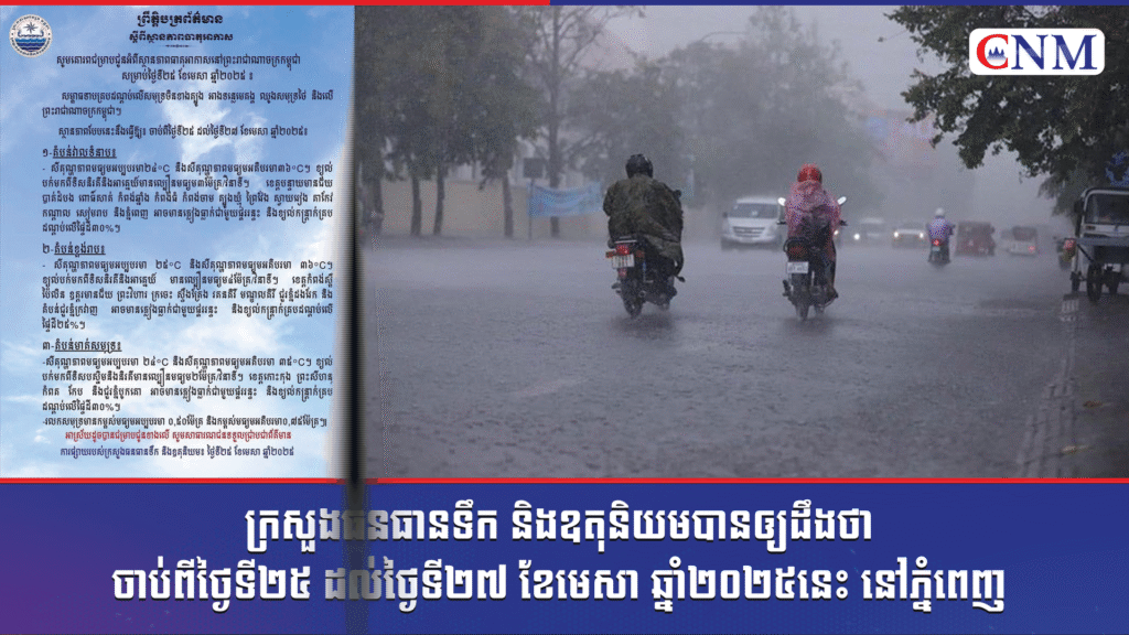 ក្រសួងធនធានទឹក និងឧតុនិយមបានឲ្យដឹងថា ចាប់ពីថ្ងៃទី២៥ ដល់ថ្ងៃទី២៧ ខែមេសា ឆ្នាំ២០២៥នេះ នៅភ្នំពេញ