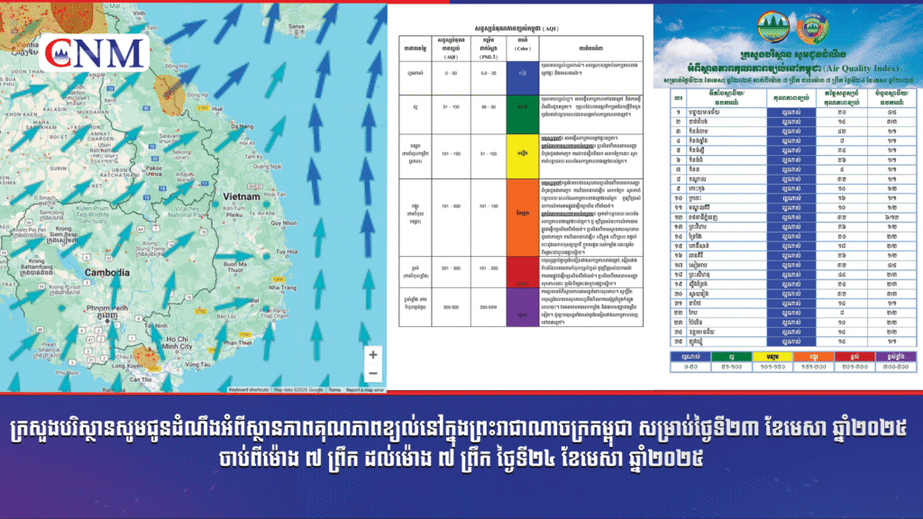 ក្រសួងបរិស្ថានសូមជូនដំណឹងអំពីស្ថានភាពគុណភាពខ្យល់នៅក្នុងព្រះរាជាណាចក្រកម្ពុជា សម្រាប់ថ្ងៃទី២៣ ខែមេសា ឆ្នាំ២០២៥ ចាប់ពីម៉ោង ៧ ព្រឹក ដល់ម៉ោង ៧ ព្រឹក ថ្ងៃទី២៤ ខែមេសា ឆ្នាំ២០២៥