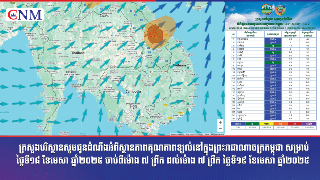 ក្រសួងបរិស្ថានសូមជូនដំណឹងអំពីស្ថានភាពគុណភាពខ្យល់នៅក្នុងព្រះរាជាណាចក្រកម្ពុជា សម្រាប់ថ្ងៃទី១៨ ខែមេសា ឆ្នាំ២០២៥ ចាប់ពីម៉ោង ៧ ព្រឹក ដល់ម៉ោង ៧ ព្រឹក ថ្ងៃទី១៩ ខែមេសា ឆ្នាំ២០២៥
