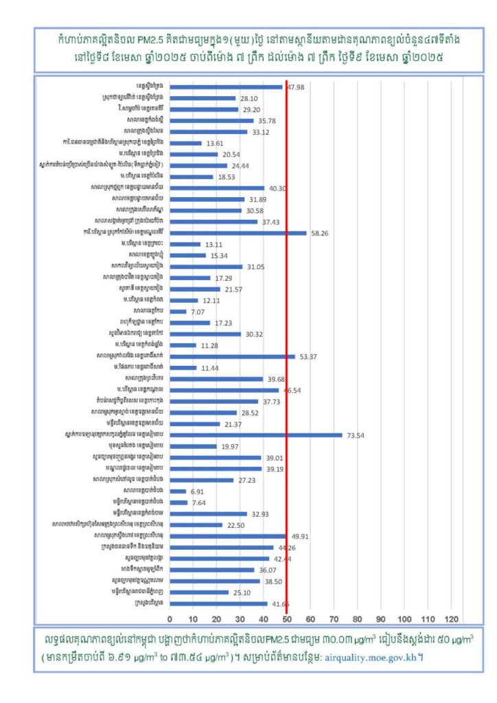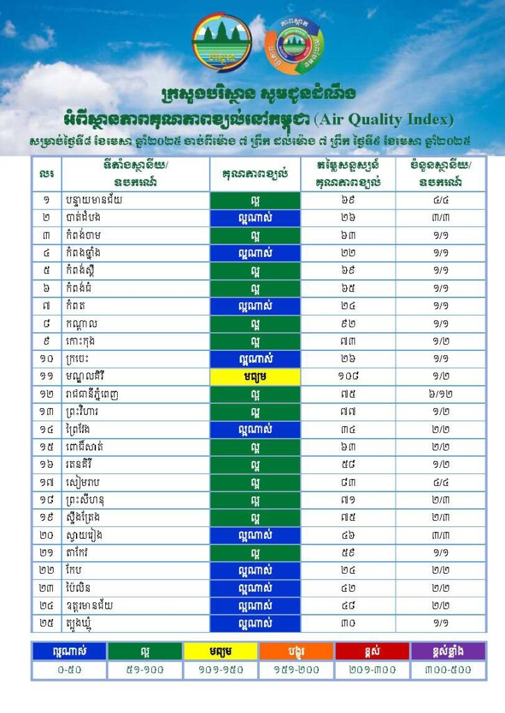 សេចក្ដីជូនដំណឹង ក្រសួងបរិស្ថានសូមជូនដំណឹងអំពីស្ថានភាពគុណភាពខ្យល់នៅក្នុងព្រះរាជាណាចក្រកម្ពុជា សម្រាប់ថ្ងៃទី៨ ខែមេសា ឆ្នាំ២០២៥ ចាប់ពីម៉ោង ៧ ព្រឹក ដល់ម៉ោង ៧ ព្រឹក ថ្ងៃទី៩ ខែមេសា ឆ្នាំ២០២៥