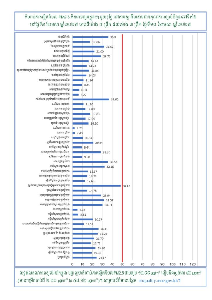 ក្រសួងបរិស្ថានសូមជូនដំណឹងអំពីស្ថានភាពគុណភាពខ្យល់នៅក្នុងព្រះរាជាណាចក្រកម្ពុជា សម្រាប់ថ្ងៃទី៩ ខែមេសា ឆ្នាំ២០២៥ ចាប់ពីម៉ោង ៧ ព្រឹក ដល់ម៉ោង ៧ ព្រឹក ថ្ងៃទី១០ ខែមេសា ឆ្នាំ២០២៥