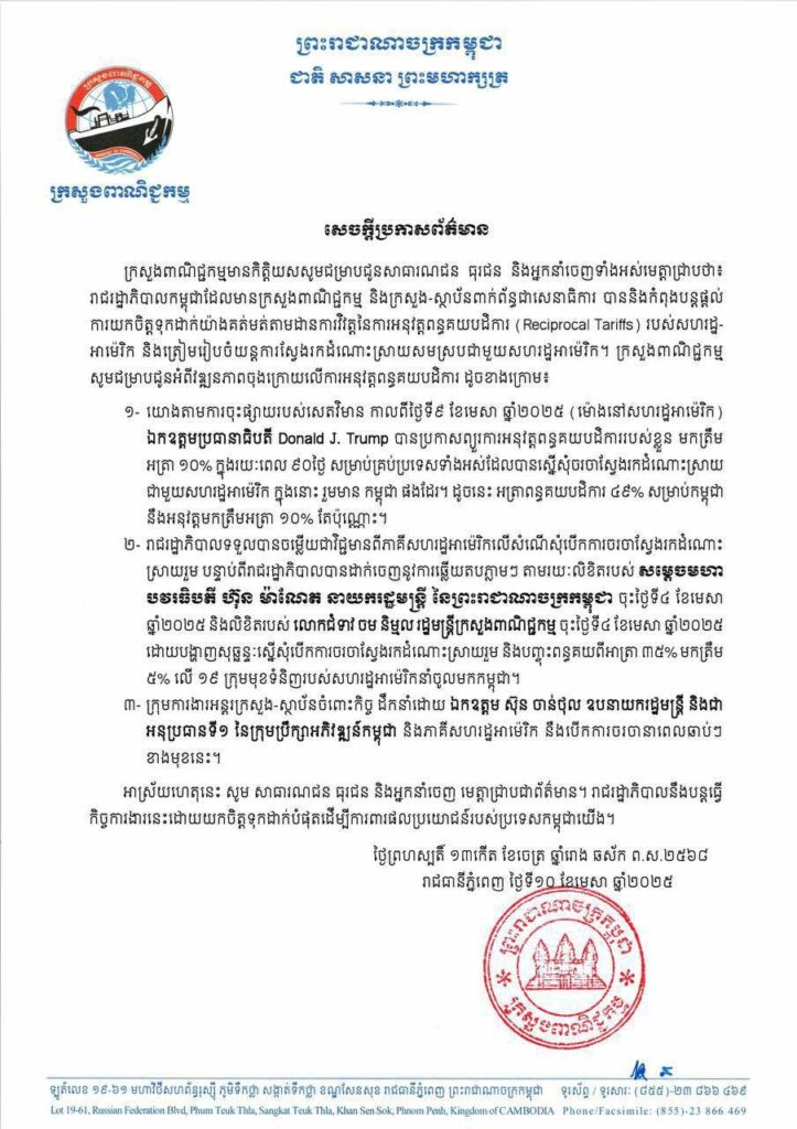 “សេចក្តីប្រកាសព័ត៌មានរបស់ក្រសួងពាណិជ្ជកម្ម ស្ដីពីវឌ្ឍនភាពចុងក្រោយលើការអនុវត្តពន្ធគយបដិការ (Reciprocal Tariffs) របស់សហរដ្ឋអាម៉េរិក”