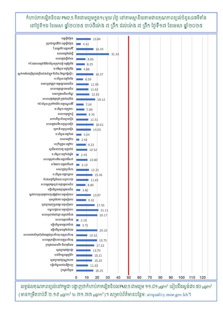 ណឹងអំពីស្ថានភាពគុណភាពខ្យល់នៅក្នុងព្រះរាជាណាចក្រកម្ពុជា សម្រាប់ថ្ងៃទី១៦ ខែមេសា ឆ្នាំ២០២៥ ចាប់ពីម៉ោង ៧ ព្រឹក ដល់ម៉ោង ៧ ព្រឹក ថ្ងៃទី១៧ ខែមេសា ឆ្នាំ២០២៥