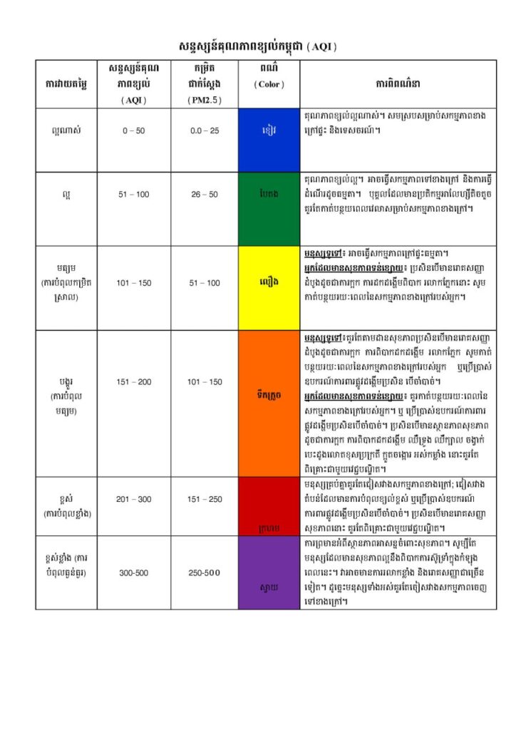 ពណ៌ខៀវៈ គុណភាពខ្យល់ល្អណាស់មាន ខេត្តបន្ទាយមានជ័យ ខេត្តកំពង់ចាម ខេត្តកណ្តាល ខេត្តកំពង់ធំ ខេត្តមណ្ឌលគីរី ខេត្តព្រះវិហារ ខេត្តរតនគិរី ខេត្តស្ទឹងត្រែង ខេត្តកំពង់ឆ្នាំង ខេត្តកោះកុង ខេត្តពោធិ័សាត់ រាជធានីភ្នំពេញ ខេត្តសៀមរាប ខេត្តព្រះសីហនុ ខេត្តតាកែវ ខេត្តបាត់ដំបង ខេត្តកំពត ខេត្តក្រចេះ ខេត្តស្វាយរៀង ខេត្តកែប ខេត្តត្បូងឃ្មុំ ខេត្តឧត្តរមានជ័យ ខេត្តព្រៃវែង និងខេត្តប៉ៃលិន