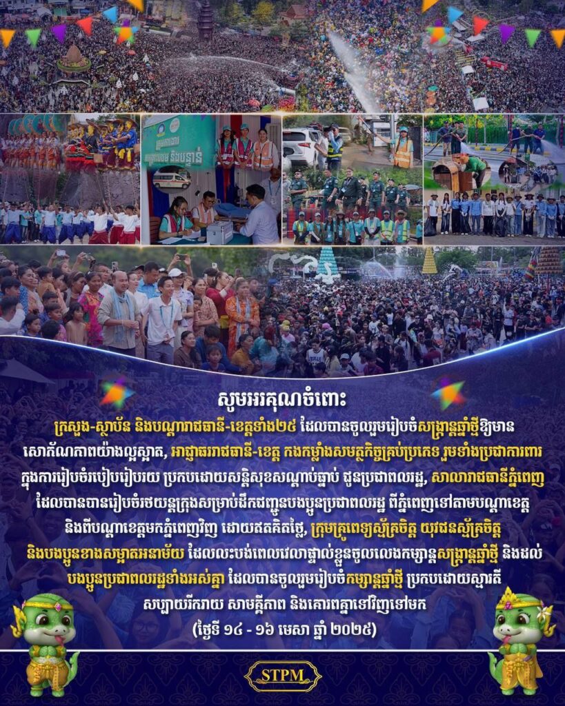 សម្តេចធិបតី ហ៊ុន ម៉ាណែត នាយករដ្ឋមន្ត្រីនៃព្រះរាជាណាចក្រកម្ពុជា បានលើកឡើងថា ក្នុងនាមរាជរដ្ឋាភិបាល និងក្នុងនាមខ្លួនខ្ញុំផ្ទាល់ ខ្ញុំសូមថ្លែងអំណរគុណយ៉ាងជ្រាលជ្រៅចំពោះក្រសួង-ស្ថាប័ន អាជ្ញាធរដែនដីគ្រប់លំដាប់ថ្នាក់ គ្រប់រាជធានី-ខេត្ត ក៏ដូចជានៅក្រៅប្រទេស កងយោធពលខេមរភូមិន្ទ កងនគរបាលជាតិ កងរាជអាវុធហត្ថ ប្រជាការពារ អ្នកអនាម័យ និងកម្លាំងស្ម័គ្រចិត្តគ្រប់យន្តការទាំងអស់ ដែលបានចូលរួមសហការបំពេញភារកិច្ចរៀបចំ តុបតែង និងប្រចាំការការពារសន្តិសុខសណ្តាប់ធ្នាប់ ធានាបាននូវសុវត្ថិភាព បង្កលក្ខណៈដល់ការកម្សាន្តសប្បាយរបស់លោកតាលោកយាយ អ៊ំពូមីង បងប្អូន ព្រមទាំងបានញ៊ាំងឱ្យការប្រារព្ធពិធីបុណ្យចូលឆ្នាំថ្មីប្រពៃណីជាតិខ្មែរ ឆ្នាំម្សាញ់ សប្ដស័ក ព.ស ២៥៦៨ នៅទូទាំងប្រទេស បានប្រព្រឹត្តទៅដោយភាពសប្បាយ រីករាយ សោភ័ណភាព សេចក្តីថ្លៃថ្នូរ សុខសុវត្ថិភាព របៀបរៀបរយល្អ ប្រកបដោយមោទកភាពជាតិ៕