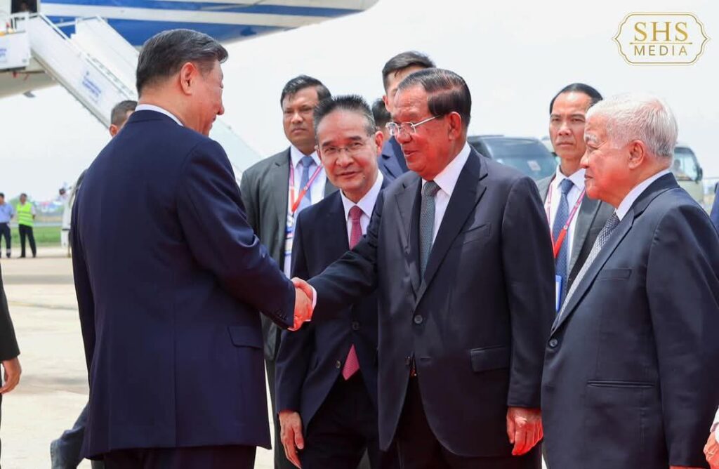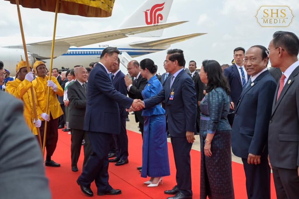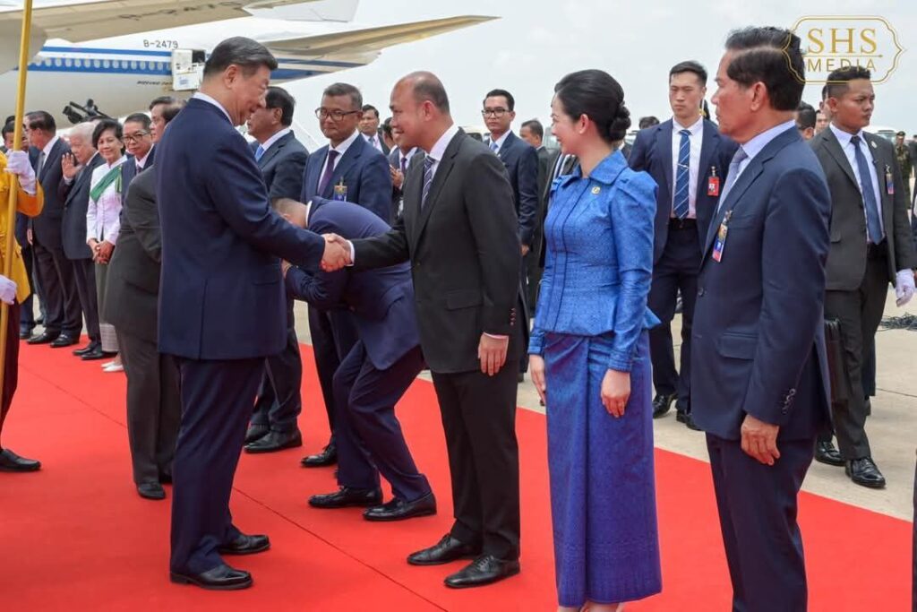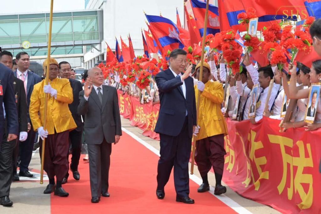 នៅអាកាសយានដ្ឋានអន្តរជាតិភ្នំពេញ ព្រឹកថ្ងៃទី១៧ ខែមេសា ឆ្នាំ២០២៥ នេះ សម្ដេចអគ្គមហាសេនាបតីតេជោ ហ៊ុន សែន ប្រធានព្រឹទ្ធសភានៃព្រះរាជាណាចក្រកម្ពុជា បានអញ្ជើញដង្ហែព្រះករុណាព្រះបាទសម្ដេច ព្រះបរមនាថ នរោត្តម សីហមុនី ព្រះមហាក្សត្រនៃព្រះរាជាណាចក្រកម្ពុជា ស្ដេចយាងក្នុងការទទួលបដិសណ្ឋារកិច្ចស្វាគមន៍យ៉ាងកក់ក្តៅចំពោះវត្តមាននៃការអញ្ជើញមកដល់របស់ឯកឧត្តម Xi Jinping ប្រធានាធិបតីនៃសាធារណរដ្ឋប្រជាមានិតចិន ក្នុងឱកាសដែលឯកឧត្តមអញ្ជើញបំពេញទស្សនកិច្ចផ្លូវរដ្ឋរយៈពេល២ ថ្ងៃ (១៧-១៨ ខែមេសា ឆ្នាំ២០២៥) នៅព្រះរាជាណាចក្រកម្ពុជា។
