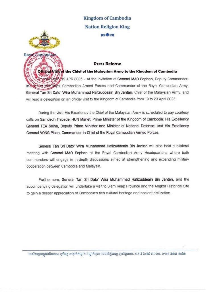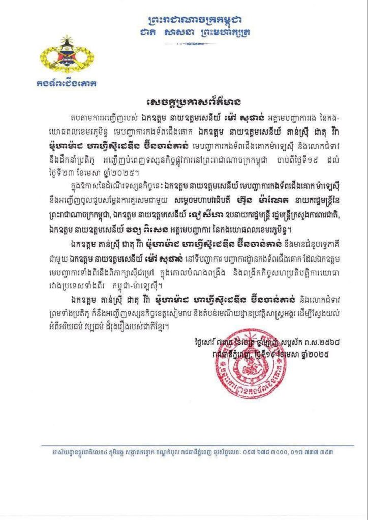 ឯកឧត្តម នាយឧត្តមសេនីយ៍ តាន់ស្រុី ដាតុ វីរ៉ា ម៉ូហាម៉ាដ ហាហ្វីស៊ូដេឌីន ប៊ីនចាន់តាន់ មេបញ្ជាការកងទ័ពជើងគោកម៉ាឡេស៊ី និងលោកជំទាវ នឹងដឹកនាំប្រតិភូ អញ្ជើញបំពេញទស្សនកិច្ចផ្លូវការនៅព្រះរាជាណាចក្រកម្ពុជា ចាប់ពីថ្ងៃទី១៩ ដល់ ថ្ងៃទី២៣ ខែមេសា ឆ្នាំ២០២៥នេះ។